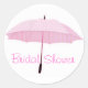 Joli sceau d'enveloppe de douche nuptiale fait à l'aide d'un autocollant rond, en arrière - plan blanc, avec des graphiques d'un parapluie rose et de la Fête des mariées de lecture de texte de couleur rose. Personnalisez le texte en fonction des besoins de votre parti. Idéal pour les mariés ou les baby showers.