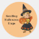 Une photo douce et rétro d'une petite fille déguisée en sorcière, tenant un citrouille souriant, est présentée sur cet autocollant rond pour Halloween. Avec le message, "Envoi de Halloween Hugs", en fait un grand autocollant pour cet envoi spécial Halloween, la réservation de ferraille, la décoration et plus encore!