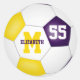 Ces autocollants ronds de 3 pouces de soccer sportif pour une fille ou un garçon présentent un graphique de ballon de soccer simple avec des panneaux violet, or et blanc - personnaliser avec le nom de l'athlète, monogramme et numéro de maillot - par katz_d_zynes