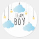 Équipe Garçon. Un autocollant de vote de jeu de révélation du sexe amusant avec des étoiles dorées mignonnes et des nuages bleus sur des ficelles. Conçu par Thisisnotme©