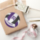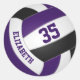 Ces autocollants ronds de volley-ball couleur équipe pour les garçons ou les filles disposent d'un simple graphique de volley-ball avec des panneaux violets, noirs et blancs sur lesquels vous pouvez customiser le nom du joueur et le numéro de maillot dans une police de style lettre de variété - par katz_d_zynes