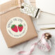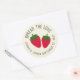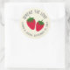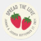 Deux fraises illustrées sont encadrées par un texte personnalisable pour faire de ces autocollants ronds une façon douce à la mariage étiquette ou à la douche faveurs de confiture ou de confiture de fraise et diffuser l'amour à des amis et la famille et commémorer la date mariage du couple.