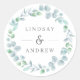 Ajoutez-en de jolies à vos enveloppes d'invitation ou à vos faveurs de mariage avec cet autocollant qui comporte une couronne botanique bleu vert d'eau sur un arrière - plan blanc, et vos noms en gris.