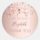 Un autocollant, une étiquette de faveur pour un anniversaire féminin. Un fond rose gold faux avec des étoiles élégantes de couleur rose gold et cuivre. Le texte : Merci. Modèle pour le nom et la date. Le nom est écrit en rose gold foncé avec un style de lettrage à la main moderne et grand.
