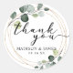Elégante végétation d'eucalyptus avec des cercles d'or cadrage script et typographie classique mariage Merci label autocollant.