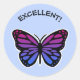 Cet autocollant représente un joli papillon rose et bleu avec la légende "EXCELLENT !" en texte noir sur un arrière - plan bleu clair - ou vous pouvez modifier ceci pour votre message préféré. Une façon attrayante pour un enseignant ou un parent de montrer l'appréciation pour un grand travail ou un effort supplémentaire par exemple