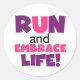 Si vous aimez courir, courir 5Ks, 10Ks, demi-marathons ou marathons, vous adorerez ce texte coloré en violet et rose qui lit Run and Embrace Life ! Cours et Embrassez des T-shirts, des tasses, des sacs, des cartes, des autocollants, des porte - clés, des mousepads, des coques iphone, des magnets et bien plus encore !