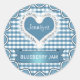 Un autocollant chaleureux et à l'allure chaleureuse pour étiquette votre boulangerie ou des conserves contient le texte "Fabriqué avec amour dans ma cuisine, j'espère que vous apprécierez chaque bouchée" enroulé autour d'un coeur qui tient votre nom. Une bannière ruban pour tenir votre nom de produit se trouve sous le coeur sur un arrière - plan de en vichy dans un cercle de pétoncles. Consultez d'autres options de couleur en recherchant le titre "Fabriqué avec l'amour En vichy".