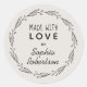 Sticker rond Étiquette de produit Fabriqué avec Love Wreath Neutral Eggshell Un autocollant rond en noir et en coquille d'oeuf élégant pour vos cadeaux faits à la main, les aliments faits maison ou les produits faits maison à vendre. Une couronne d'art botanique borde le texte qui dit "Fabriqué avec amour par" suivi de votre nom dans la typographie de script tendance. Vous pouvez facilement changer le nom en votre propre nom sur le modèle de personnalisation.