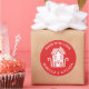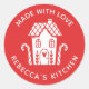 Un autocollant personnalisé "fait avec amour" avec une jolie maison blanche en pain d'épices avec un coeur et les mots, fait avec amour sur un arrière - plan de couleur rouge. Personnalisez-le en ajoutant votre propre nom. Une jolie touche finale pour tous vos cadeaux faits maison. Conçu pour vous par Blackberry Boulevard.