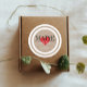Joli étiquette autocollant rond personnalisé avec un cercle texturé en lin rond et cadre avec coeur rouge au milieu avec le texte "Fabriqué avec amour" écrit dans deux polices modernes. Le texte est entièrement personnalisable.