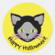 Parfait pour la fête d'Halloween faveurs ou friandises, cet autocollant rond présente un graphisme amusant de chat noir et un texte facile à customiser.