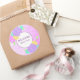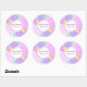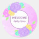 Autocollant Bienvenue Bébé avec fleurs roses, violettes et jaunes personnalisable avec fond violet. Parfait pour sceller les enveloppes, les sacs de faveurs, à ajouter aux paquets et bien plus encore.