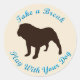 Le texte "Prenez une pause, jouez avec votre chien" entoure une image de Bulldog. S'arrêter pour profiter de nos chiens peut nous rendre plus détendus et en meilleure santé. Prenez le temps chaque jour de jouer avec votre chien.