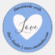 Des autocollants ronds au coeur blanc, le texte "fait main avec amour" et votre nom et site Web personnalisés ou tout autre texte personnalisé sur un arrière - plan bleu clair. Le mot "amour" est écrit dans un élégant script de calligraphie. Utilisez comme scellés d'enveloppe, autocollants pour les cadeaux et les faveurs, ou tout autre emballage de produit.