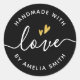 Autocollants ronds avec dégradé doré (image imprimée) cœurs, le texte "fabriqué à la main avec amour" et votre nom personnalisé en blanc sur fond noir. Le mot "amour" est écrit dans une police de caractères calligraphiée élégante. Utilisez comme sceaux pour enveloppes, autocollants pour cadeaux et faveurs, emballage de produits, etc. Suivez-nous sur Facebook: @businessstationery pour plus de produits, d'actualités, de ventes et plus encore.