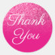 Photo de parties scintillant rose vif couplée à un ombre de coordination éclatante. Le message texte "Merci" dans un joli style de calligraphie est personnalisable. Brillant rose chaud merci autocollants. Design art numérique photo chic pour un quinceañera, mariage ou autre événement spécial. Faux parties scintillant design imprime comme une photo.