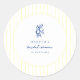 Autocollants de faveur de douche de mariage ronds bleus et jaunes inspirés de l'Italie avec des citrons gribouillés à la main en bleu marine et des rayures jaunes. Personnalisez avec le nom et la date de l'événement.