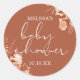 Un autocollant de favori de baby shower élégant et stylé avec une typographie élégante et un beau feuillage botanique rustique sur un fond de terre cuite. Conçu par Thisisnotme©