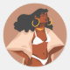 Sticker Rond Femme noire, Bikini blanc, Prêt plage