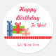 Sticker rond festif avec cadeaux d'anniversaire sur la gauche est idéal pour tout anniversaire. Il est disponible en 2 tailles et peut être collé n'importe où ou peut être utilisé comme étiquette sur les enveloppes des cartes de voeux d'anniversaire. Customisez en ajoutant le nom du destinataire.