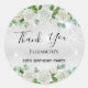 Un autocollant pour une fête d'anniversaire girly et glamour de 50e (ou tout âge). Un faux arrière - plan métallique d'aspect argenté, de la poussière de parties scintillant faux, des fleurs blanches et de la verdure. Le texte : Merci est écrit avec un grand script de style à la main moderne. Personnalisez et ajoutez un nom et 50 ans.