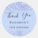Un autocollant pour une fête d'anniversaire du 10e anniversaire (ou de n'importe quel âge). Un arrière - plan bleu clair, bleu bébé, avec de la poussière de parties scintillant fausse. Le texte : Merci est écrit avec un grand script de style à la main moderne. Personnalisez et ajoutez un nom et un âge.
