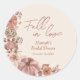 Ajoutez une touche saisonnière charmante à votre fête de mariage avec notre autocollant rond classique citrouille "Tombez amoureux". Caractérisé par des florales aquarelles douces et des citrouilles patrimoniales dans des tons chauds rose saumon, mauve et ivoire, cet autocollant élégant est le détail final parfait pour toute célébration d'automne.