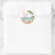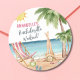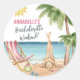 Autocollant rond classique pour enterrement de vie de jeune fille sur le thème de la plage à l'aquarelle. Un thème de plage à l'aquarelle cool avec des nuances de rose et de sarcelle, créant l'ambiance pour une escapade à la plage avec la mariée et ses meilleures amies. Des voyages en Floride, en Californie, ou même quelque chose de plus international comme au Mexique, à Hawaï ou aux Bahamas, ce week-end entre filles va être incroyable ! Chaise de plage rose et blanche, parasol et une fille se prélassant au soleil. Des palmiers qui se balancent, des coquillages à collectionner - c'est tout simplement l'ambiance tropicale décontractée. Avec des polices modernes qui ajoutent une touche stylée, c'est le look parfait pour votre week-end de bachelorette. Juste vous et votre groupe, créant des souvenirs sur fond