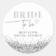 Cette autocollante future mariée présente de faux sequins pailletés argentés, des polices modernes en gras et un cœur dessiné à la main amusant. Modifiez facilement le texte noir pour répondre aux besoins de votre événement. Cet autocollant est parfait pour votre fête de mariage glamour, votre petit-déjeuner de mariage ou votre week-end de célibataire.