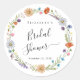 Autocollant de fête de mariage inspiré du style bohème avec une couronne aquarelle de fleurs sauvages et "Fête de mariage" dans un script de calligraphie élégant.
