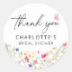 Exprimez votre gratitude avec style grâce à cet autocollant rond classique élégant et floral "Merci" pour la douche de la mariée, orné d'une délicate aquarelle de fleurs sauvages colorées, mettant en valeur les florales roses blush, entrelacées de verdure luxuriante et de papillons gracieux. Conçu avec une calligraphie sophistiquée, cet autocollant ajoute une touche raffinée et romantique, parfait pour sceller les sacs de faveurs, les enveloppes ou les cadeaux. Un détail charmant pour compléter une garden-party ou une douche de la mariée "l'amour est en fleurs", laissant aux invités une impression sincère et élégante.