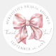 Un autocollant pour une baby shower rose avec un nœud rose pâle aquarelle adorable. En haut, il y a le nom de la future mariée et « Bridal Shower », et en bas, la date. Au centre, à côté du nœud rose, il y a « Merci ! » dans un script élégant. Ce design simple et minimaliste de shower de mariage utilise un texte gris dans un mélange de typographie serif et script, créant un look coquette sophistiqué et charmant. Vous pouvez personnaliser les couleurs de police et l'arrière-plan pour l'adapter à votre style. Étiquette d'autocollant de remerciement de thème de shower de mariage élégant à l'aquarelle avec nœud rose personnalisé.