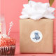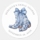Ce design d'autocollant rond présente une paire de bottes de cowboy bleues élégantes avec un nœud à l'aquarelle douce au centre, ajoutant une touche rustique douce. Le nom de la mariée et la phrase « Bridal Shower » s'enroulent autour du bord supérieur dans une police classique grise serif, avec la date incurvée le long du bas dans le même style simple.