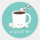 stickers de vacances pour une fête de Noël Hot Chocolate. Ces autocollants comportent une tasse souriante de cacao chaud avec un sucre de canne et plusieurs guimauves joyeuses sur un arrière - plan turquoise. Tous les mots peuvent être customisés. Fête de Noël Chocolat chaud cacao chaud Classic rond Sticker Sweetsham Food Art | ©Melissa Patton - Artiste/Illustrateur