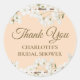 Elégant joli blanc fleurie merci, autocollant rond classique avec délicate fleur de printemps encadrant vos détails de douche nuptiale dans une élégante police de script d'or sur un arrière - plan de couleur pêche. Parfait comme scellés d'enveloppe ou de préférence autocollants pour vos invités. Conçu par Thisisnotme©