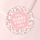 Un autocollant rond pour le premier anniversaire de Berry, mignon et féminin, parfait pour les faveurs de fête, les sceaux d'enveloppe ou les décorations. Ce design présente un motif de fraise rose aquarelle avec des feuilles vertes autour du bord. Le centre comporte un cercle rose doux avec "Kid's Name BERRY FIRST Birthday" en blanc, ajoutant une touche douce et personnalisée.