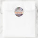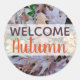Stickers "Bienvenue automne" personnalisables avec une belle photo de feuilles tombés avec de minuscules champignons jaunes.
