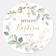 Baptême bébé / Sticker rond Christening. Cette conception présente une illustration de feuillage vert et doré en aquarelle.