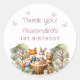 Célébrez le 1er anniversaire de votre petite fille avec cet adorable autocollant de remerciement personnalisé sur le thème animal des bois! Doté d'un ours mignon, de renard, d'écureuil et de lapin faisant une fête dans la forêt, ce design est plein de charme. Les animaux se rassemblent autour d'une table à souches d'arbres, dégustant de délicieux gâteaux et boissons, tandis que les arbres verdoyants ajoutent à l'atmosphère festive. Placé contre un arrière - plan blanc immaculé, cet autocollant de remerciement doux est parfait pour les faveurs de la fête et apportera une touche spéciale à la célébration du premier anniversaire de votre fille. Express votre gratitude dans le style avec ce gardien mignon et mémorable!