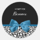 Personnalisez en ajoutant le nom de votre ado fille du parti à ces stickers motifs empreintes de léopard en noir et blanc à la mode avec un ruban bleu cobalt classique élégant attaché dans un joli arc girly. Image imprimée plate, pas le ruban réel.