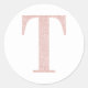 Lettre serif moderne classique T avec un effet parties scintillant en or rose faux contre des autocollants ronds blancs classiques solides. Le graphisme glam parties scintillant est numériquement effets créés et s'imprime à plat comme une photo. Phoques de l'enveloppe Monogram pour la célébration de l'anniversaire de votre ami. Vous pouvez customiser la couleur de l'arrière - plan ou utiliser l'un des filtres système comme superposition de couleur pour l'art numérique. Ce graphique se transfère bien vers les produits moyens et petits.