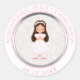 Mignonnes filles roses et argent saintes collants de communion - Douce fille avec de longs cheveux bruns en robe et des prières à la tête dans le centre encadré dans un faux anneau métallique, argent. Avec un look perlé, gris et blanc arrière - plan. Nom personnalisé et 'Première Sainte Communion' dans élégant, rose assorti, texte courbe ci-dessus. Le bas affiche la date courbée rose. Bordé de contour rose et blanc. Jolie fille rose et argent de communion enveloppes phoques. Cliquez sur l'option Personnaliser pour modifier les couleurs, la taille et les polices du texte.