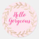 Autocollant rond classique en forme de couronne d'or rose vif, jeune et joli, avec les mots "Hello Gorgeous" dans un élégant script rose vif.