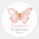 Le petit papillon rose en sort. Favoriser les autocollants Ajoutez du texte personnalisé au dos pour fournir toutes les informations supplémentaires nécessaires pour vos invités. Ce modèle de 1er anniversaire mignon et girly avec un papillon rose aquarelle avec des arroses d'or.