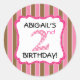 Cet autocollant rond présente un thème tendance pour le deuxième anniversaire d'une fille. L'arrière - plan est rose pâle et brun chocolat rayures verticales et un cadre tourbillonnant au milieu comporte un grand numéro rose deux, représentant le 2e anniversaire de votre enfant. Le texte personnalisable vous permet d'ajouter le nom de votre enfant. Consultez www.zazzle.com/daisylin712 pour obtenir une invitation correspondante.