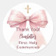 A white background. Decorated with a large pink bow and a golden cross. Personalize and add the name. Text: Thank you!