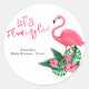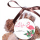 Baby shower invitation design avec flamingo rose avec frondes de feuilles de palmier vert luxuriant et fleurs d'hibiscus tropical. "Aloha Baby". Un motif à fleurs tropicales aux couleurs arrière - plans noires habille le dos de la carte.