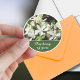 Sur cet autocollant personnalisé circulaire, des fleurs de rose blanches simples et délicates s'épanouissent parmi un fond de feuillage vert et de branches brunes. J'adore l'union de ces trois éléments qui forment une image saisissante et belle. En dessous, un espace pour une courte phrase ou un nom indique actuellement "Je pense à vous." Vous pouvez modifier ce texte si vous préférez autre chose.