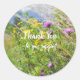 Campagne, style rustique autocollant à thème nature. Belle journée ensoleillée à la campagne. Fleurs sauvages colorés (tansy jaune, bouton de célibataire violet) et herbes dans le pré, montagnes bleues dans l'arrière - plan. Vous pouvez supprimer le texte "Merci pour votre soutien" ou le remplacer par votre propre message (cliquez sur "Personnaliser ce modèle"). Pour d'autres modifications (style de police, couleur de police, position du texte), cliquez sur "Modifier la conception".